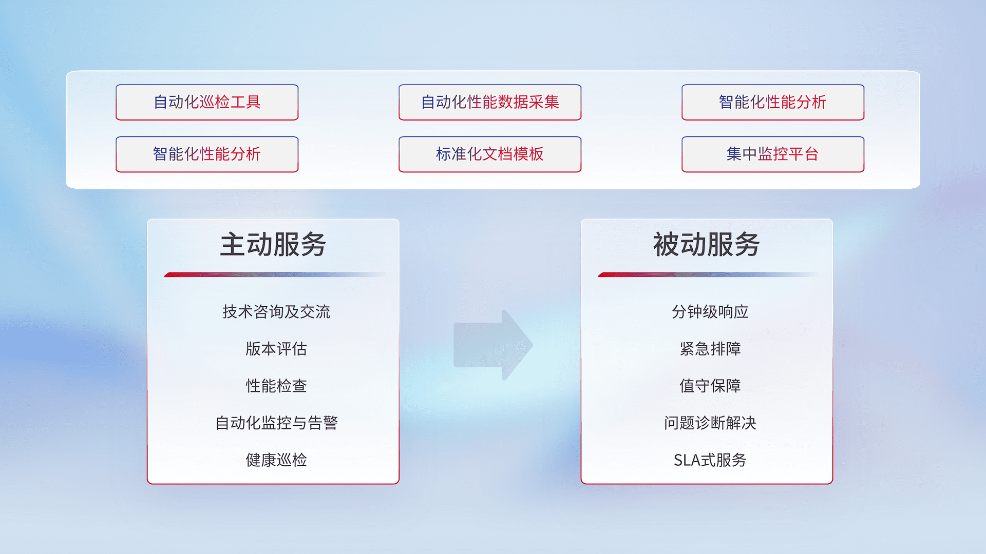 智能化工具和标准化文档,,保障服务质量,,,提供主动服务(包含技术咨询、、、版本评估、、、性能检查、、、自动化监控与告警、、、、健康巡检)和被动服务包含(分钟级响应、、紧急排障、、、值守保障、、、、问题诊断解决、、、SLA服务)。。。