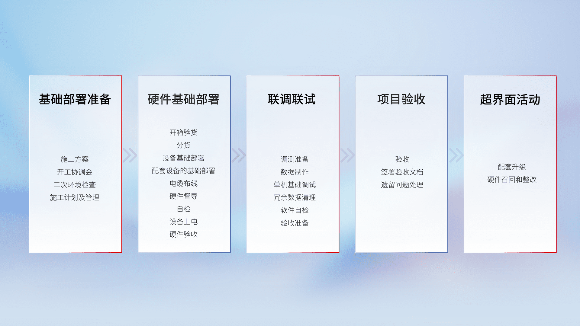 从基础部署准备、、、、硬件基础部署、、、联调联试、、项目验收、、、越界面活动的全过程可追溯,,,保证施工质量和进度。。。